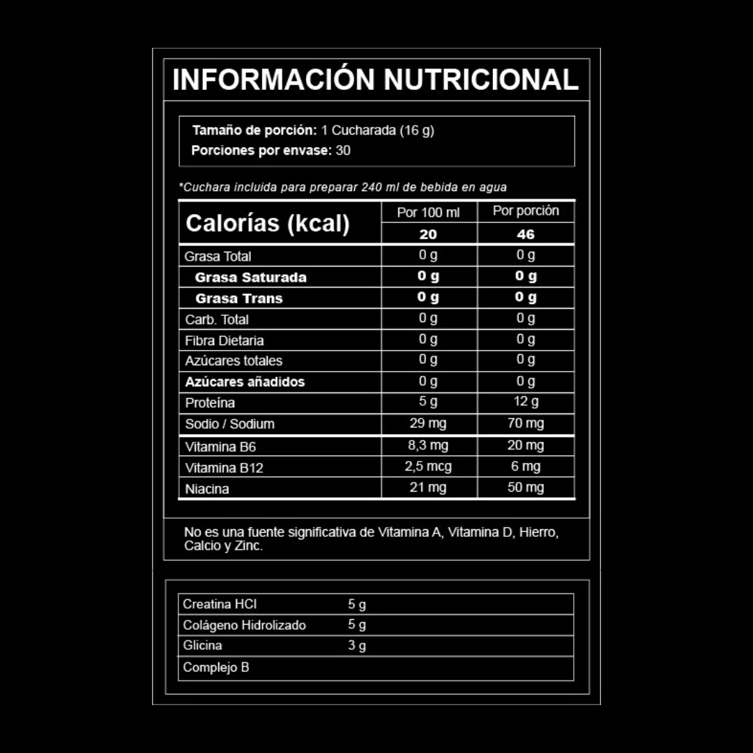Extracto uva [Aminoácido creatina clorhidrato, colágeno hidrolizado, glicina, acidulante (ácido cítrico), sabor natural y artificial)] cloruro de sodio, sucralosa (edulcorante artificial), niacina (acido nicotínico), Vit. B6 (piridoxina HCI), Vit. B12 (cianocobalamina), bicarbonato de sodio, dióxido de silicio (anticompactante), colorantes azul No.1 Cl. 42090 y rojo No.40 CI. 16035.